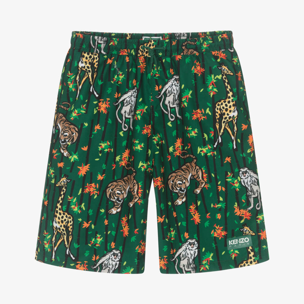 From KENZO KIDS, a pair of green swim shorts for teen boys, in the brand's vibrant bamboo jungle pattern with monkeys, tigers and giraffes. Silky smooth and lightweight, they have a soft mesh lining and a drawstring waist for an adjustable fit. Concealed mesh-lined pockets are an added feature on the side seams.