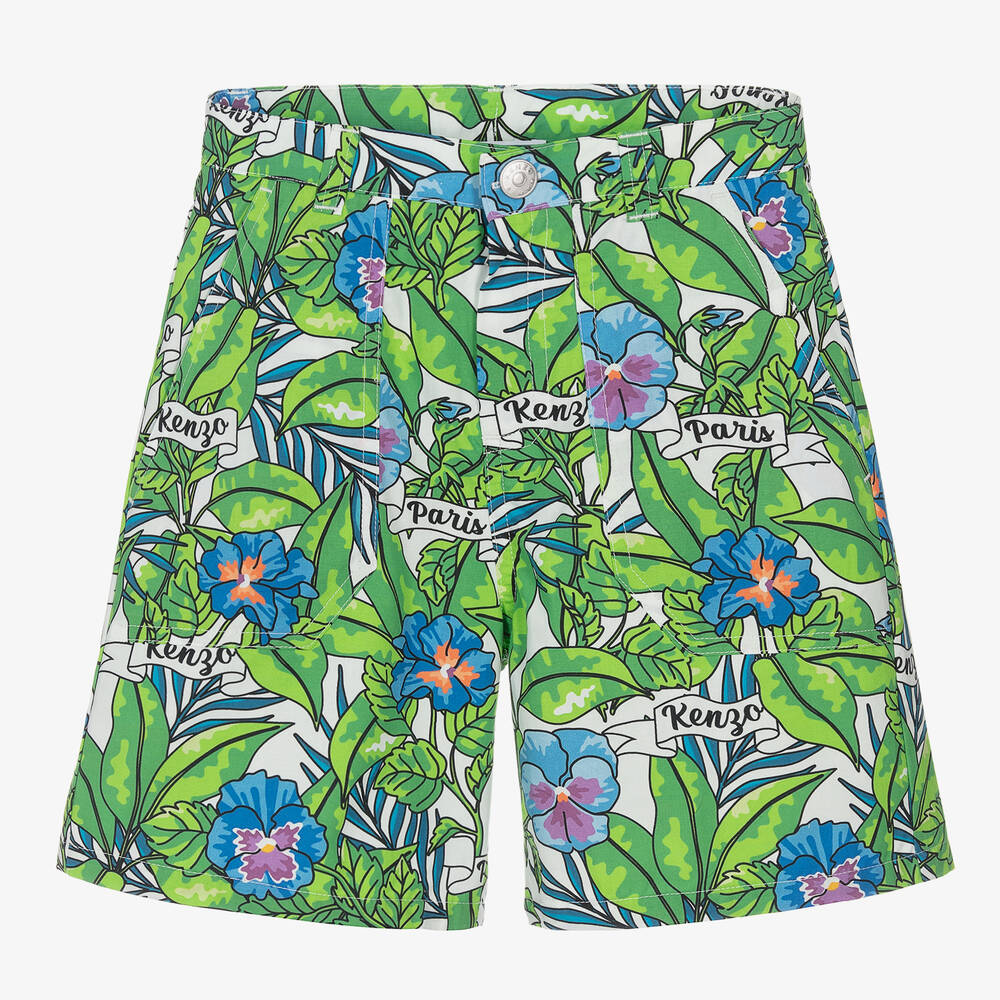 For stand-out style, these white KENZO KIDS shorts for teen boys are patterned with green and blue cartoon flowers to create a tropical jungle feel. In line with the French label's bold aesthetic, these cotton poplin shorts feature Kenzo Paris banners for a distinctive touch. They fasten easily with a branded silver popper and a zip. Roomy front and back pockets give this piece functionality.