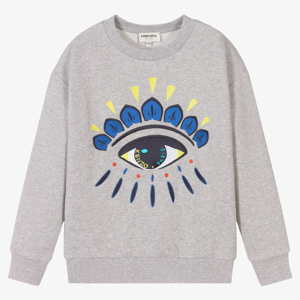 Grey marl sweatshirt for teen boys by luxury brand KENZO KIDS. Made in mid-weight cotton-blend jersey, with a fleecy inside, it has the designer's Eye logo embroidery on the front and back in blue, lime green and orange. The Wink logo is embroidered on the back in matching colours.
