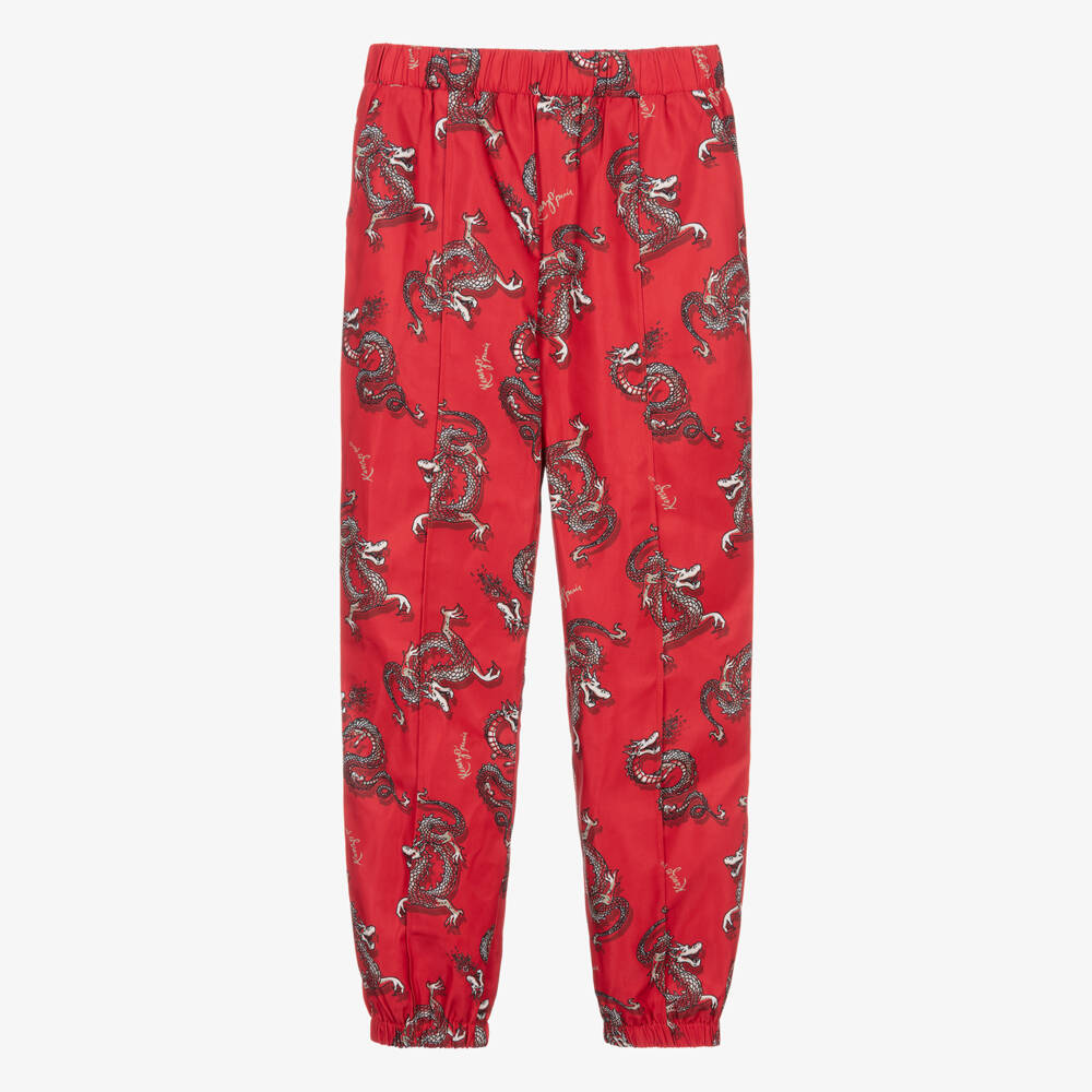 A comfortable party look for teen boys, these red trousers from KENZO KIDS are designed in a contemporary jogger fit. Forming part of the luxury French brand's Lunar New Year Capsule, they are patterned with cartoon dragons and logos. Easy to wear, these satin twill trousers have an elasticated waistband and cuffs, with a stylish seam detail down the front and useful slanted pockets.
