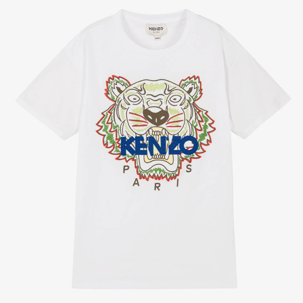 From KENZO KIDS, white T-shirt for teen boys with the iconic Tiger logo embroidered on the front in eye-catching red and green tones. For an added designer touch, this soft organic cotton jersey T-shirt is finished with 'KENZO' in bright blue across the front.