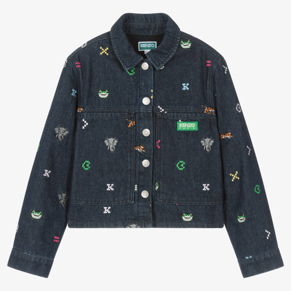Casual dark blue denim jacket for teen girls by KENZO KIDS. Designed in a stylish boxy fit, it is embroidered with jungle animals and logo lettering in a cool and colourful pixelated design. It fastens with branded poppers and has a green Kenzo Paris logo badge on one of the front patch pockets, for extra designer appeal.