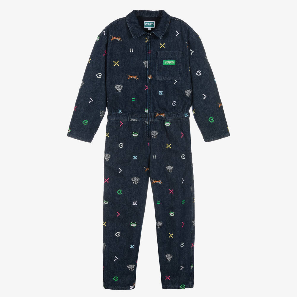 From French brand KENZO KIDS, this blue denim jumpsuit is designed for teen girls. As seen in the brand's Jungle Game collection, this stylish 80s-inspired design is embroidered with pixelated jungle animal motifs and logo lettering in fun, multicolours. Other designer details include a branded zip fastening and a distinctive Kenzo Paris logo patch on the chest pocket. Fully lined, it has a neat collared neckline and cuffs that can be turned up or down for a more casual look.