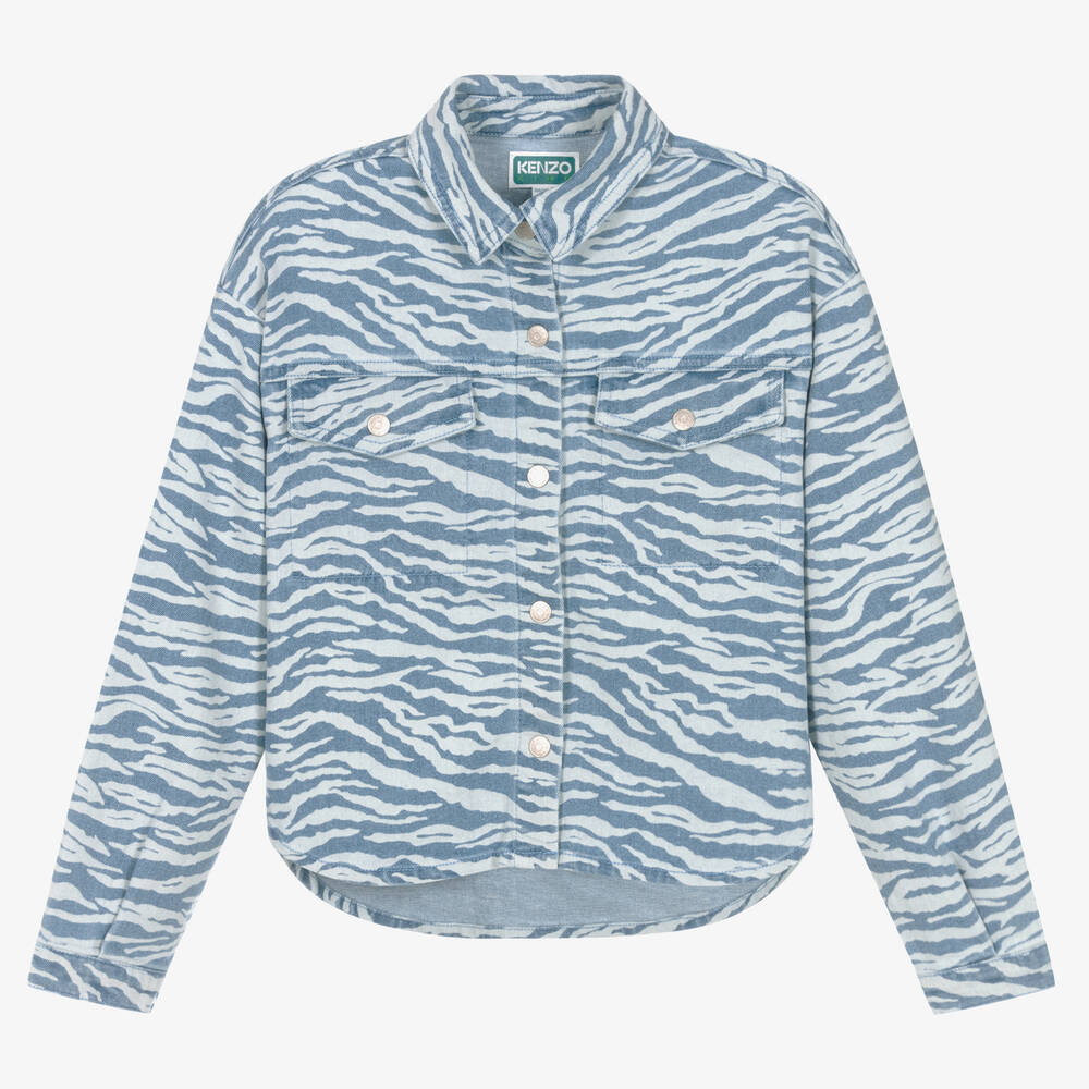 A stylish blue tiger striped jacket for teen girls by KENZO KIDS. For instant brand recognition, it features a bold orange embroidered logo on the back. Casual and comfy, it made in soft denim with a hint of stretch. It fastens with branded poppers down the front, on the chest pockets, and on the cuffs.