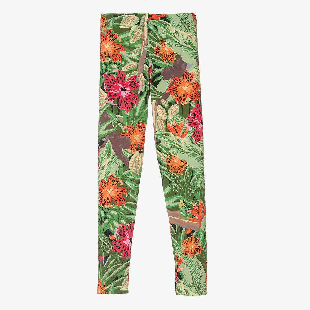 Vibrant green leggings for teen girls by KENZO KIDS, designed in an all-over green house print featuring pink and orange flowers and tropical green leaves. Made in soft and stretchy cotton jersey, these full-length leggings have an elasticated waist and a red logo embroidered on the left leg for a subtle designer detail.