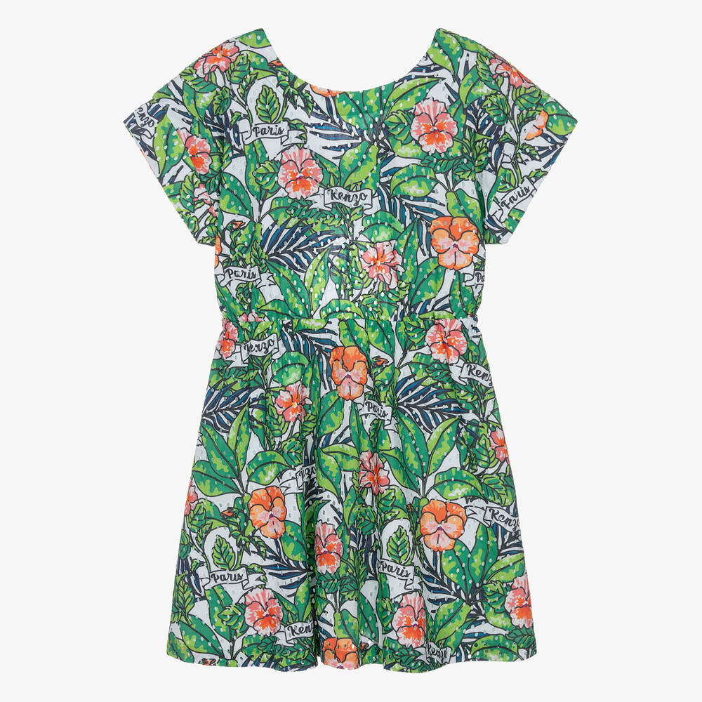 A short-sleeved dress for teen girls by KENZO KIDS, designed with vibrant green leaves and pink cartoon flowers on a white background. Made in cotton broderie anglaise, this fully lined dress has an elasticated waistband and open detailing on the back for casual dressing. Logo banners can be seen within the pattern, adding a designer touch to this playful print.