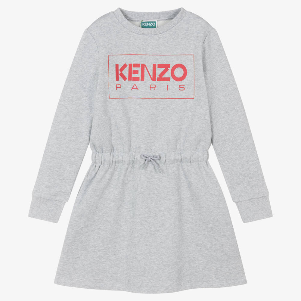 Grey marl sweatshirt dress for teen girls by French label KENZO KIDS. Made in a mid-weight cotton jersey blend, this recognisable piece is stamped with a red logo print on the front for instant brand appeal. Drawstring ties can be adjusted on the waist to secure a comfortable fit. The side seam pockets and ribbed trims add to the casual branded look.