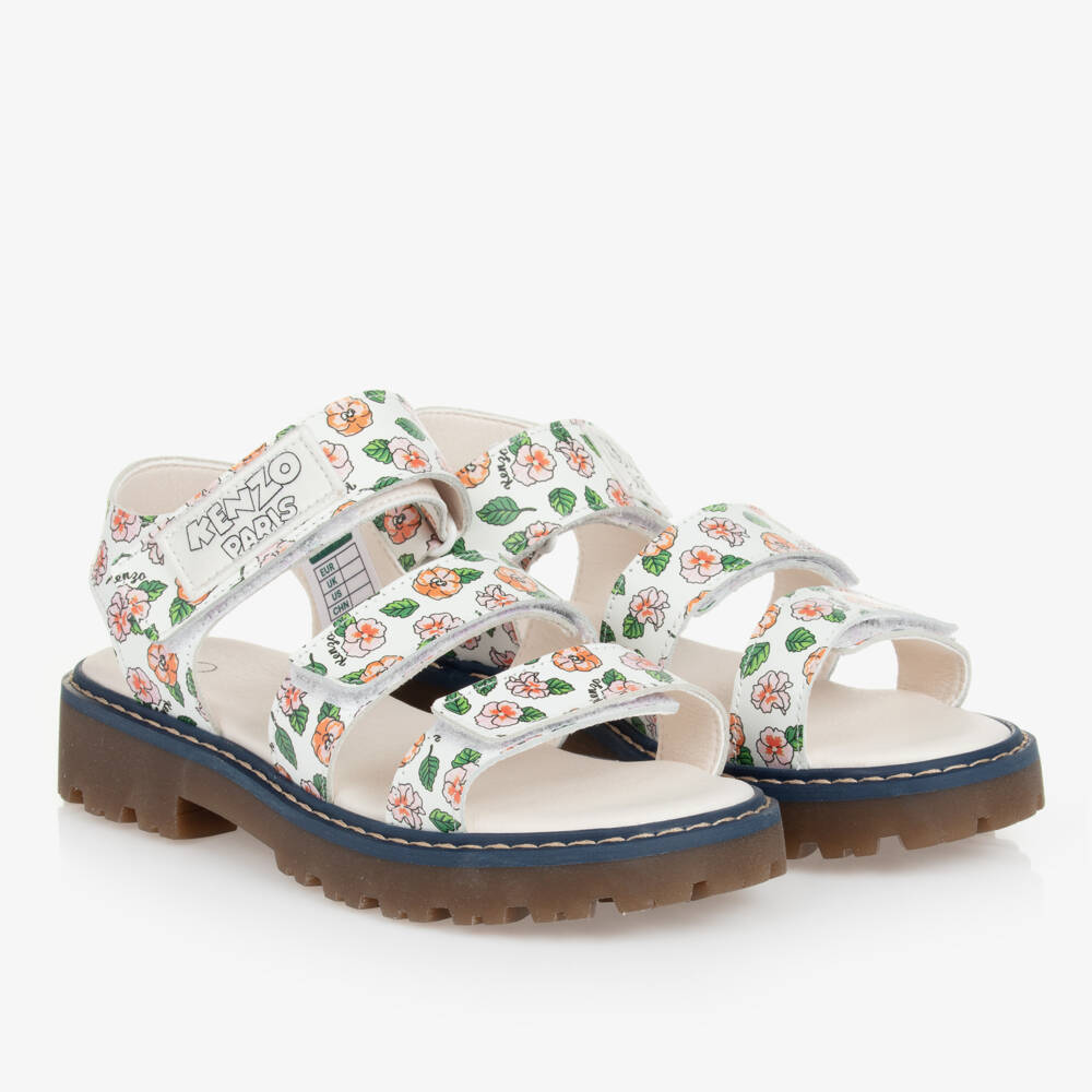 Ivory and pink floral print sandals for teen girls by KENZO KIDS, with chunky soles for a contemporary look. Designed with style and comfort in mind, they are made in soft and supple leather with three adjustable velcro straps for a great fit, and a cushioned faux leather insole. The chunky non-slip rubber sole is cleated for good grip and an embroidered Kenzo Paris logo patch adds an unmistakable designer finish.