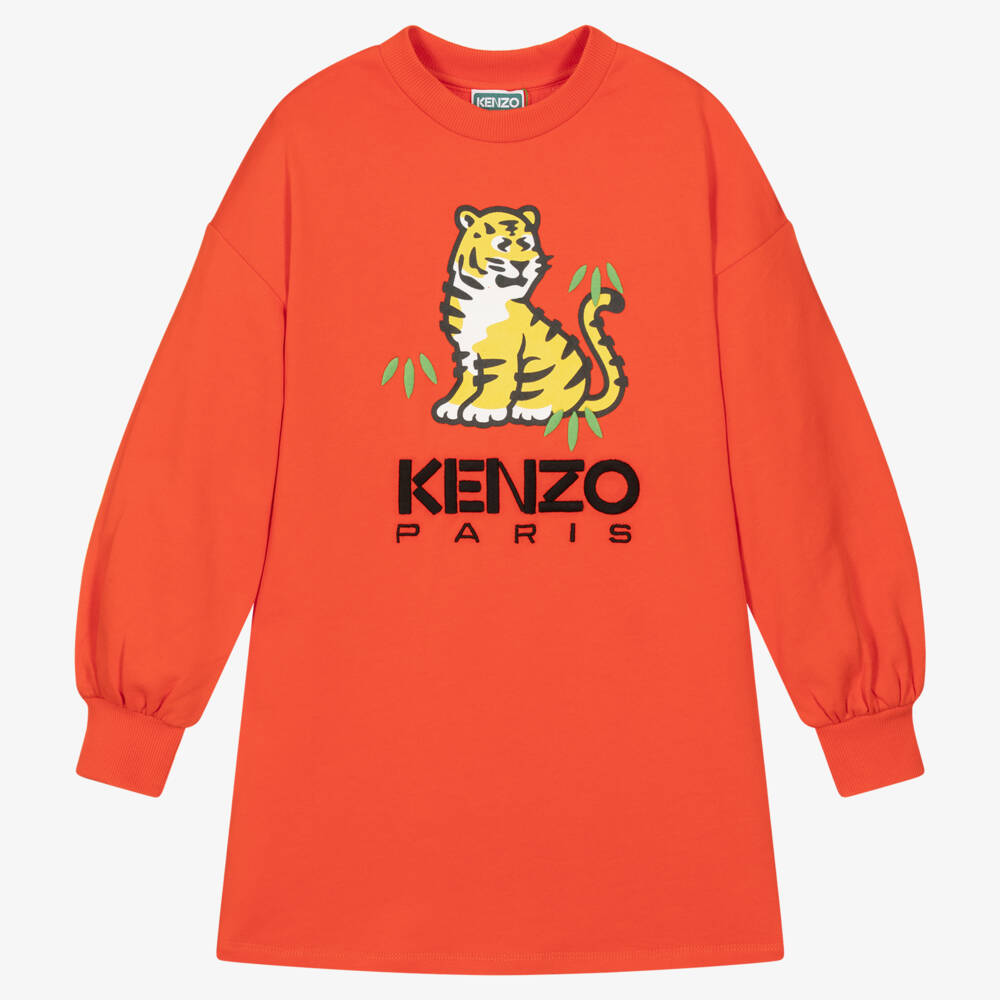 Teen girls red-orange sweatshirt dress by French designer KENZO KIDS. It has the distinctive yellow and black KOTORA Tiger print on the front, with black embroidered logo lettering underneath. Soft and mid-weight, this casual piece has dropped shoulders, ribbed trims and wide balloon sleeves for classic and simple style.