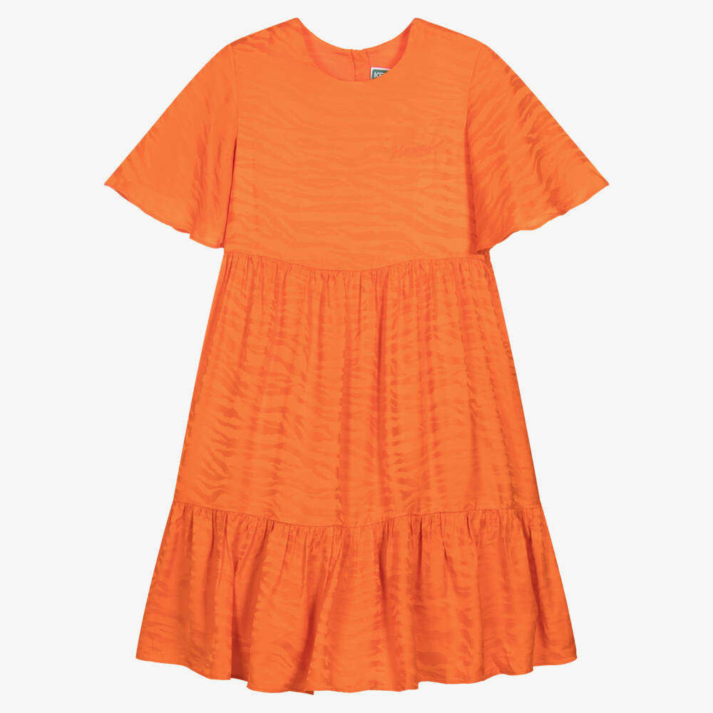 Striking orange dress for teen girls by KENZO KIDS, made in silky viscose jacquard with a lustrous tiger pattern. An on-trend, relaxed silhouette, it features flared short sleeves and a full gathered skirt with a ruffled hem. The dress is comfortably lined in soft viscose and has taffeta underskirts to add volume and shape. To complete the look, the dress has a tonal logo embroidery on the chest and fastens with a concealed zip on the back for a neat finish.