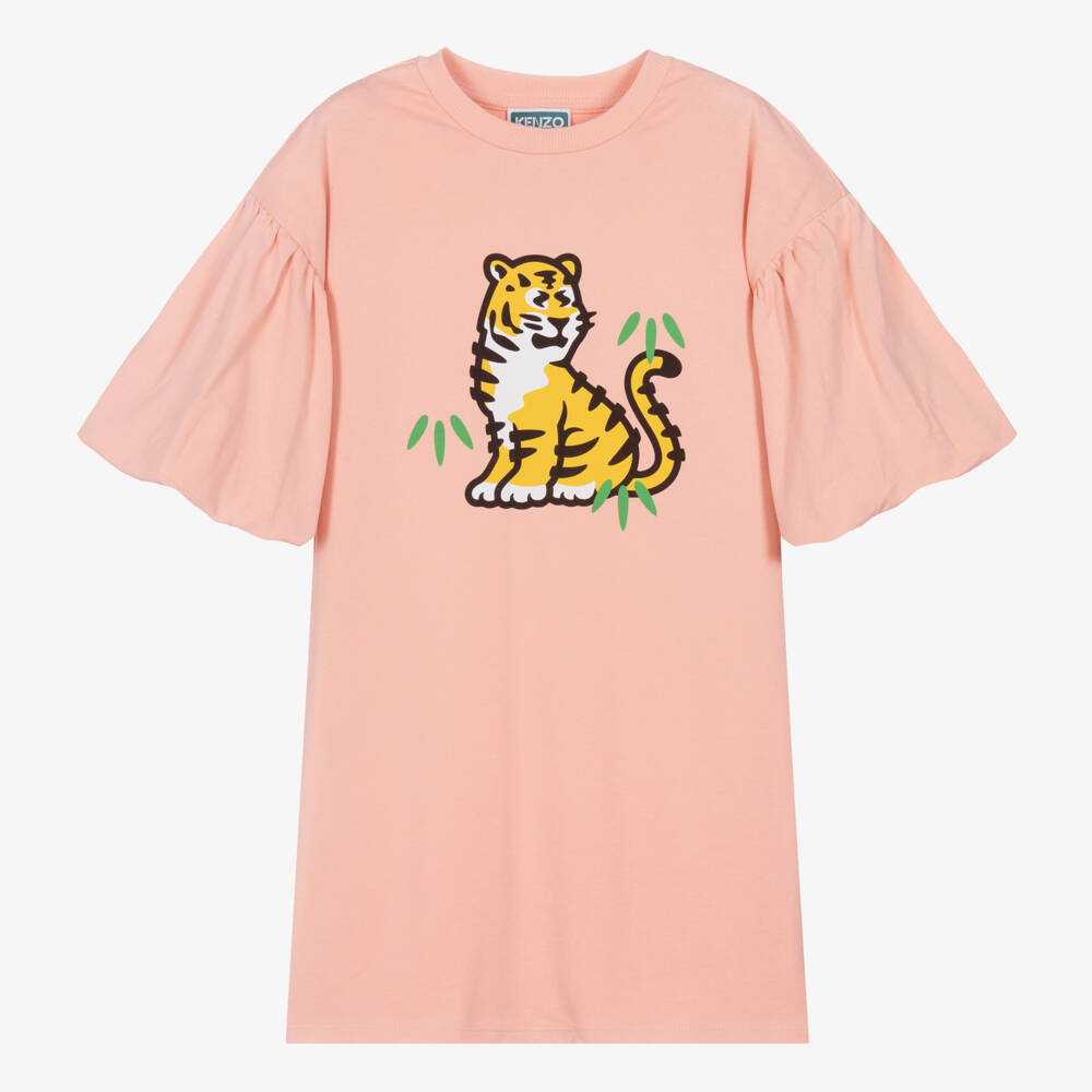A blush pink organic cotton dress for teen girls by KENZO KIDS, with the signature KOTORA Tiger printed on the chest. Casual yet stylish, this jersey dress has a relaxed fit, dramatic puff sleeves and a distinctive black logo print on the back.