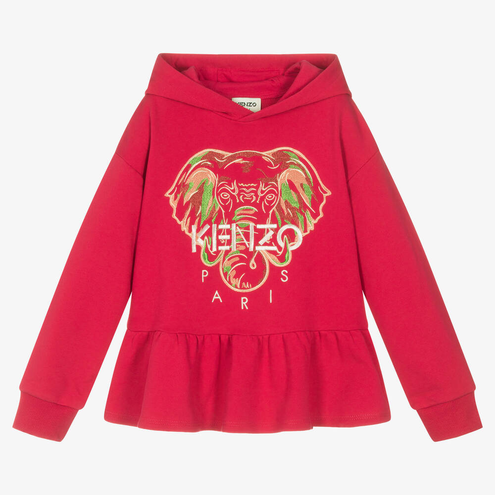 For teen girls by KENZO KIDS a pink hoodie with the iconic embroidered Elephant logo, for a designer look. It has a pretty peplum hem for a feminine silhouette and the embroidery includes hues of white, pink and green for a burst of colour. It is made in mid-weight cotton jersey for comfortable, easy wear.