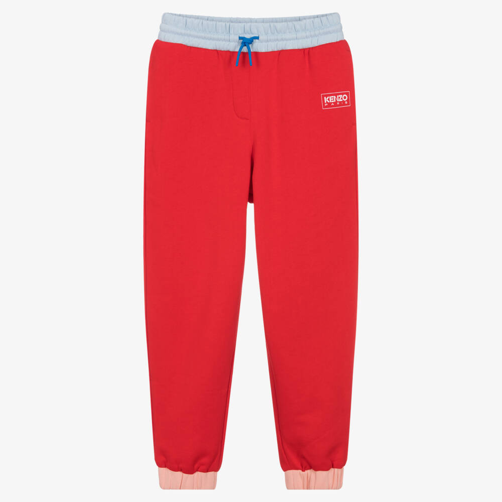 Bright red joggers for teen girls by luxury French brand KENZO KIDS, with contrasting pale blue and coral pink trims. For instant brand recognition, they have a white Kenzo Paris logo printed on the hip. Made in mid-weight cotton jersey with a cosy fleecy inside, they have an adjustable drawstring waist for an ideal fit. There are useful side pockets, with a bright yellow patch pocket on the back.