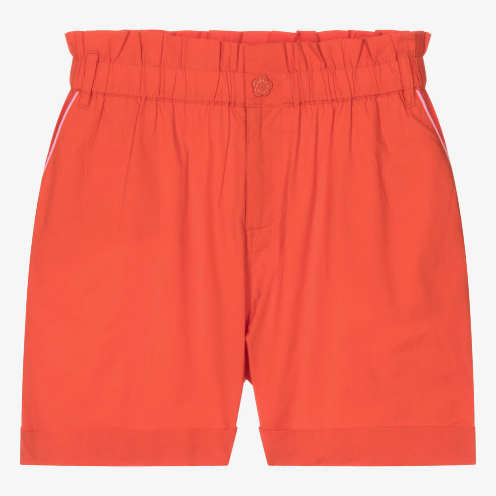 Embroidered with a vibrant tropical-themed Kenzo Paris logo on the back, these flame red cotton poplin shorts for teen girls are by luxury French brand KENZO KIDS. They have turned up hems for a relaxed look, with contrasting pink trim on the front pockets. These cool and comfortable shorts have a ruffled elasticated waist, with a front zip and signature Boke flower popper fastening.