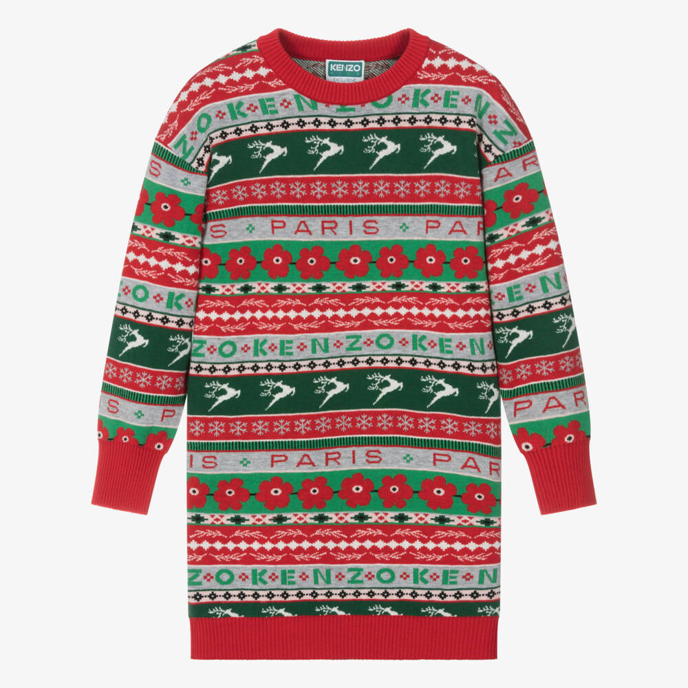Teen girls red and green dress by KENZO KIDS in festive Fair Isle stripes. The striking pattern features reindeer and snowflakes together with Boke flowers and logos for a distinctive designer touch. It is knitted in a soft and stretchy cotton blend that has a touch of wool for added warmth and comfort. The dress is completed with red ribbed trims to finish off the look.