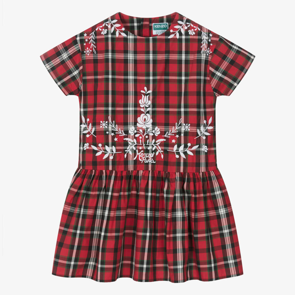 From KENZO KIDS, a red and green tartan check dress for teen girls. Adding a festive touch, it has beautiful Scandinavian-style embroidery on the shoulders and front, including the designer's Kenzo Paris logo. Simply styled with a round neck and a dropped waist gathered skirt, this short-sleeved style is made in soft cotton poplin. It is lined in lightweight cotton for comfort and fastens with a concealed zip on the back for a neat finish.
