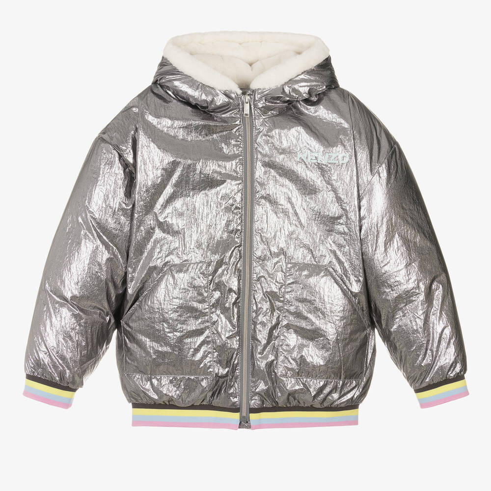 Shimmering metallic silver puffer coat for teen girls by French brand KENZO KIDS, with a water-repellent finish. Made in lightweight nylon with a crinkle effect, it has a pale blue logo print on the front and a polar bear graphic on the back. There are front pockets, and ribbed yellow, blue and pink trims to help keep the warmth in. With medium-weight padding, it has a cosy ivory plush faux fur lined hood and a smooth and silky lining.