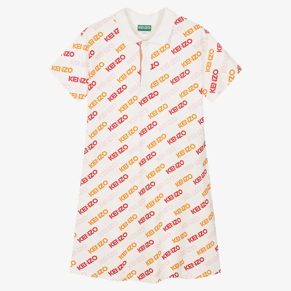 Stylish white polo dress for teen girls by KENZO KIDS, with an all-over logo print in pink and orange for instant impact. Soft and comfortable, it is made in classic cotton piqué and features a typical polo collar with three-button placket.