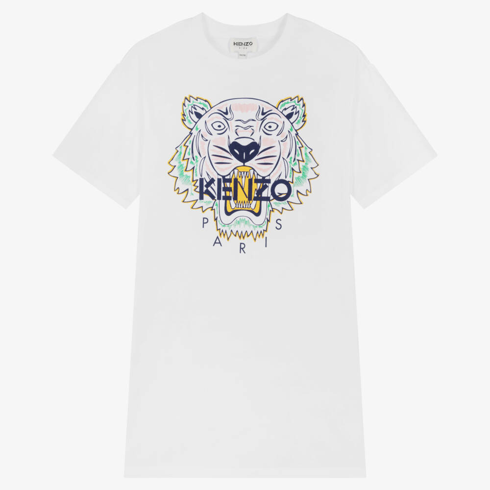 Stylish white dress for teen girls by KENZO KIDS, with the designer's iconic colourful Tiger logo print on the front. This comfortable T-shirt dress is made in super soft organic cotton jersey.
