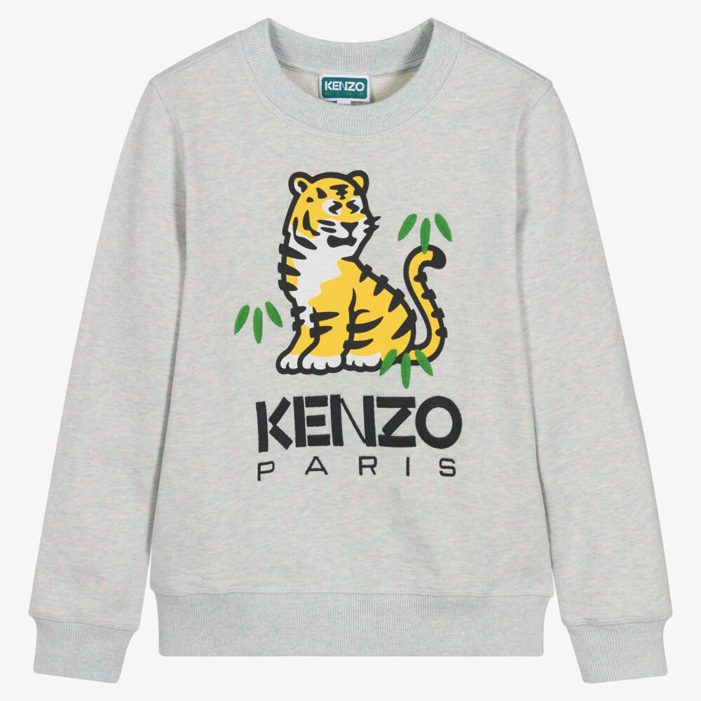 Cotton sweatshirt for teen boys and girls by KENZO KIDS, in grey with subtle purple and blue marl. This soft, stretchy and comfortable piece features a yellow, green and black KOTORA Tiger graphic on the front with embroidered detailing. The French label's cool yellow and black Tiger Tail branding decorates the back.