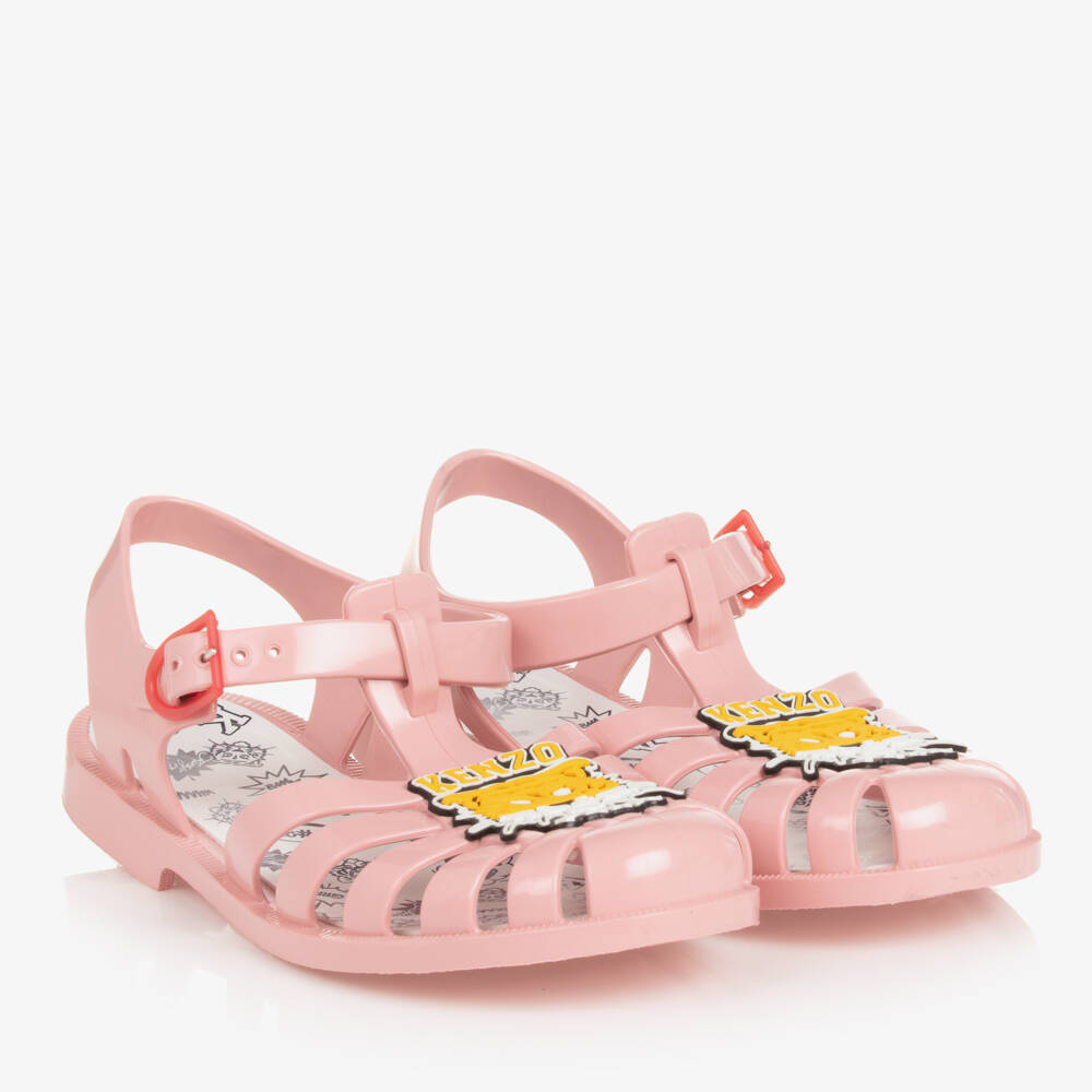 Pink jelly shoes for teen girls by KENZO KIDS, with a cartoon tiger badge on the front for a branded look. Ideal for casual times in the sun, these glossy shoes have a strappy silhouette with enclosed toes. The adjustable ankle strap is fastened securely with a metal pin buckle and the smooth insole is printed with comic-style graphics. The flexible outer sole has a studded pattern underfoot.