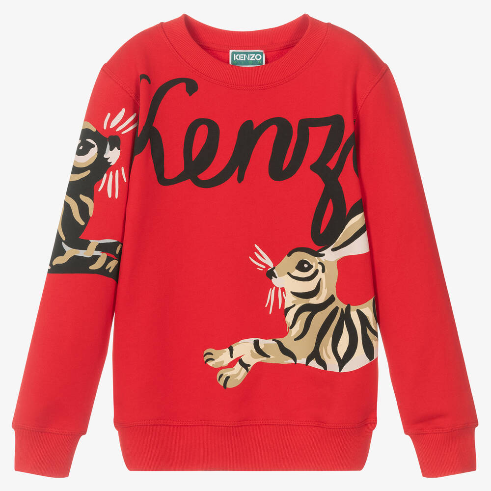 Red sweatshirt for teen girls and boys by KENZO KIDS, printed with black, grey and beige rabbits, and a bold logo for a designer statement. Easy and comfortable to wear, it is made in mid-weight cotton jersey with ribbed trims.