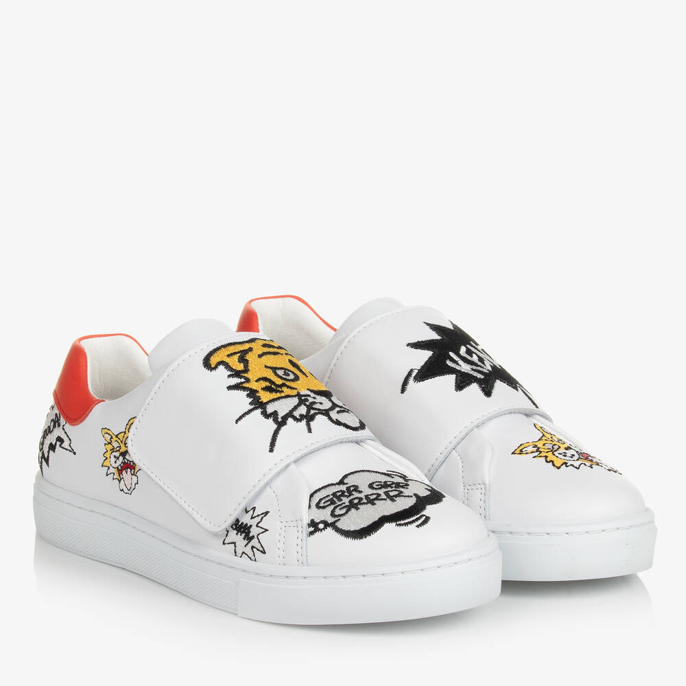 In a sleek off-white hue, these low-top leather trainers for teen boys and girls are from KENZO KIDS. Great for creating distinctive designer looks, they feature signature embroidered Tiger mascots and striking cartoon logos. A bright red trim with a Kenzo Paris logo details the back of these collegiate-inspired sneakers. They have wide velcro fastenings, lightly padded faux leather insoles and grippy rubber outsoles.