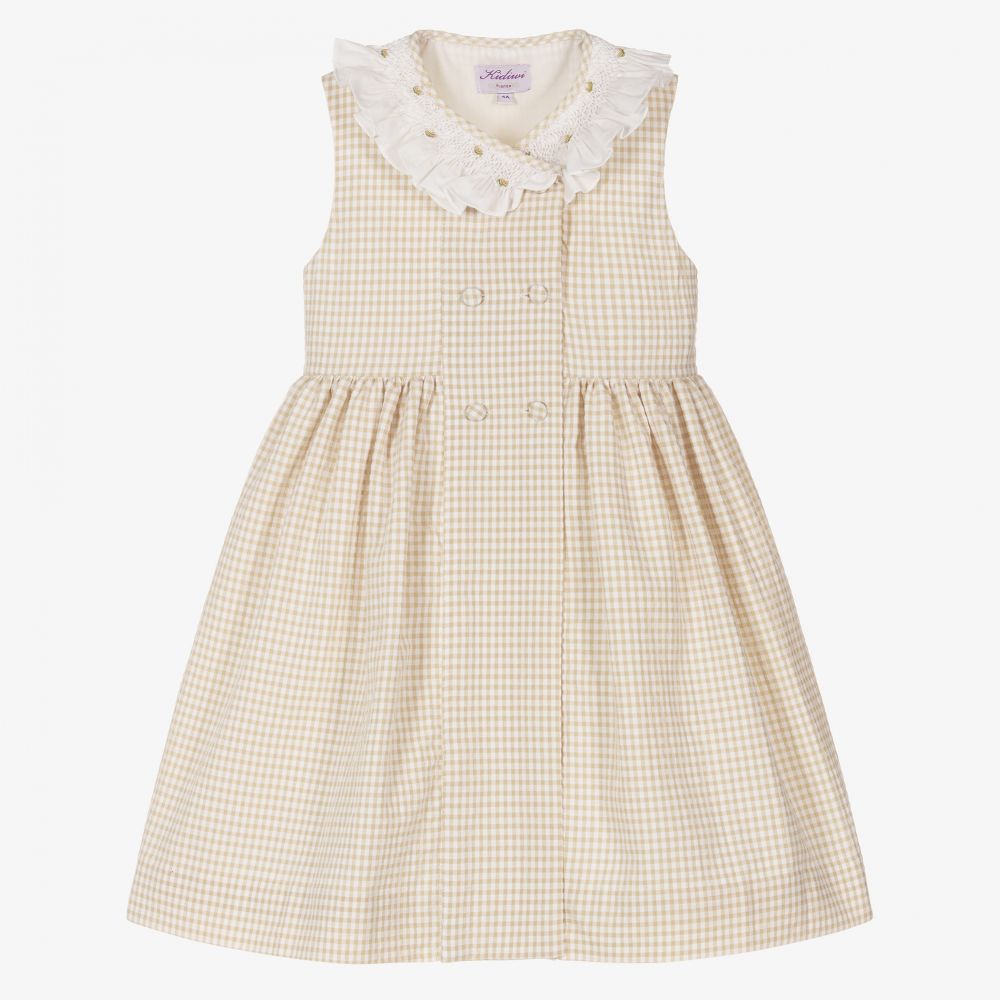 Lovely beige and white gingham dress for girls by traditional French brand Kidiwi. Handmade in lightweight cotton seersucker, it has beautiful hand smocking around the ruffled collar with hand-embroidered beige flowers. Double-breasted, with fabric-covered button fastenings on the front, it has a sash that ties in a bow around the back.