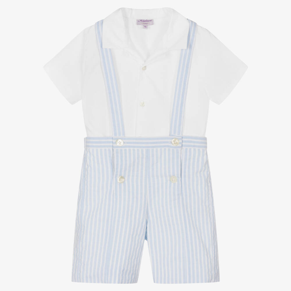 Smart-casual lightweight shorts set for boys, handmade by traditional French brand Kidiwi, just right for warmer days. The white cotton poplin shirt has a small revere collar and button fastenings on the front. The pale blue and white striped shorts are made in a summery cotton-blend seersucker, with double-breasted button fastenings on the front. Fully lined, the waistband is elasticated around the back for a comfortable fit. The adjustable, cross-over shoulder straps are secured on the back with buttons.