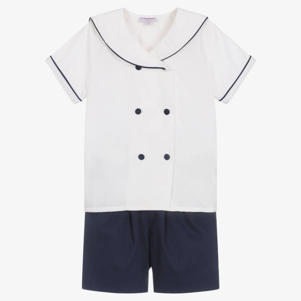 Classically styled and beautifully handmade, this sailor suit for boys is by Kidiwi. The ivory shirt is made in smooth poplin, with navy blue trims and a double breasted front button fastening. The navy blue shorts are pleated on the front and lined in lightweight cotton for comfort. They have an elasticated adjustable waist for a good fit, and fasten with buttons at the sides.
