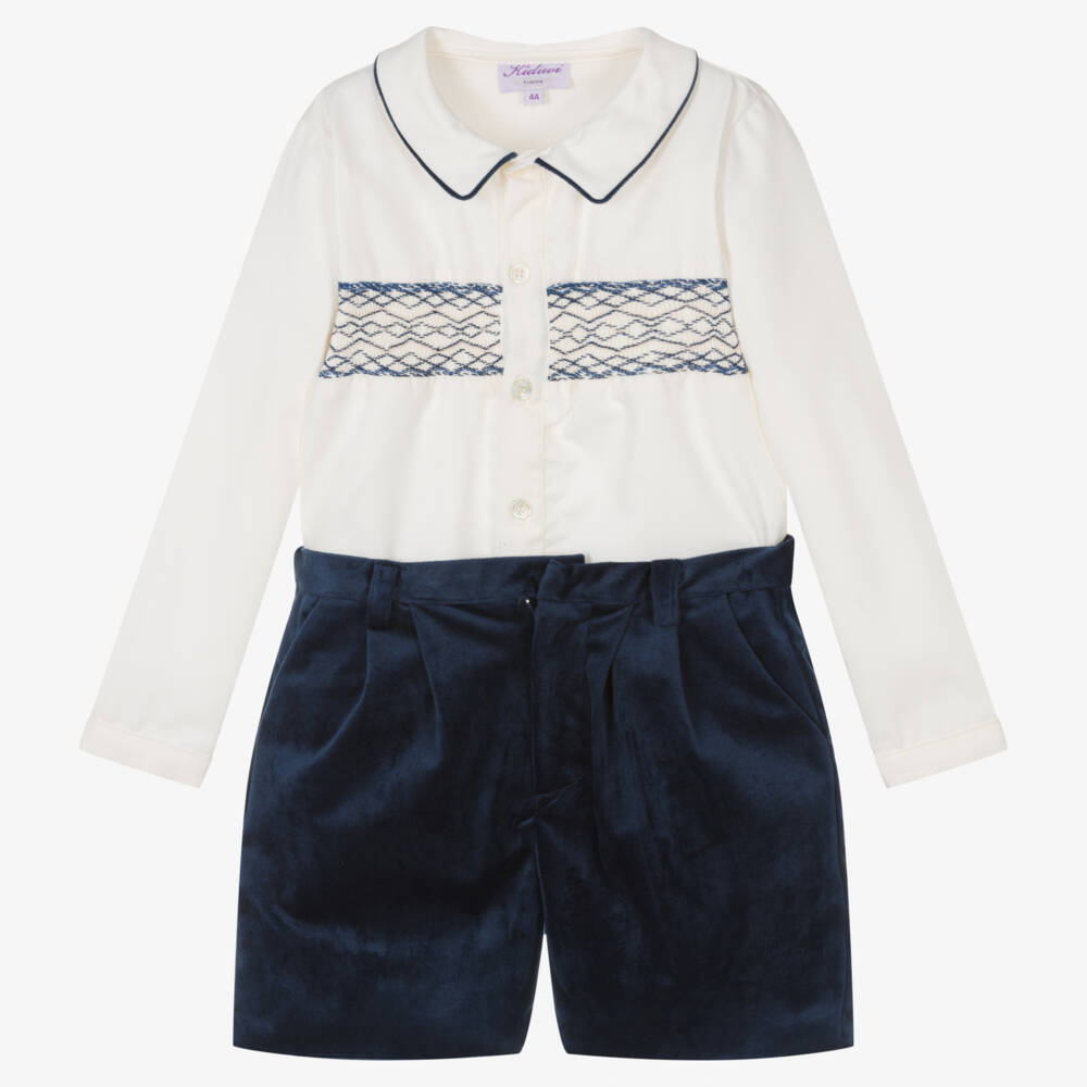 Classic in style, this shorts set for boys by Kidiwi includes an ivory cotton twill shirt and navy blue velvet shorts. The shirt has a gorgeous hand-smocked navy blue panel across the chest and traditional front button fastenings. The pointed collar has a subtle navy blue trim to complement the outfit. Lined in breathable cotton, the shorts have slanted side pockets, a comfortable elasticated waist, and a concealed front zip and button fastening.