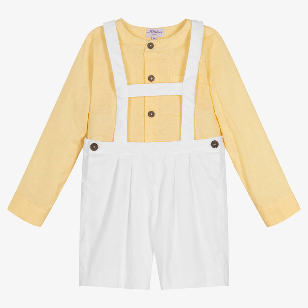 A smart-casual shirt and shorts set for little boys, beautifully handmade by French brand Kidiwi. The yellow collarless shirt is made in lightweight linen and the fully lined white shorts are in soft cotton. Traditionally styled, the shorts have fixed braces, side button fastenings, and a partly elasticated waist that is adjustable for a comfortable fit.