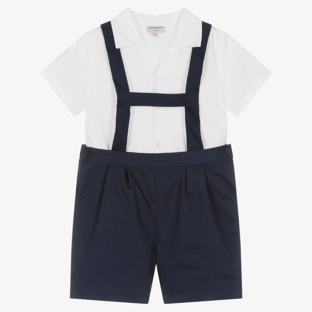 A smart-casual shirt and shorts set for boys, beautifully handmade by French brand Kidiwi. The short-sleeved white shirt is made in lightweight cotton poplin and the fully lined navy blue shorts are in a soft cotton-blend. Traditionally styled, the shorts have fixed braces, side button fastenings, and a partly elasticated waist that is adjustable for a comfortable fit.