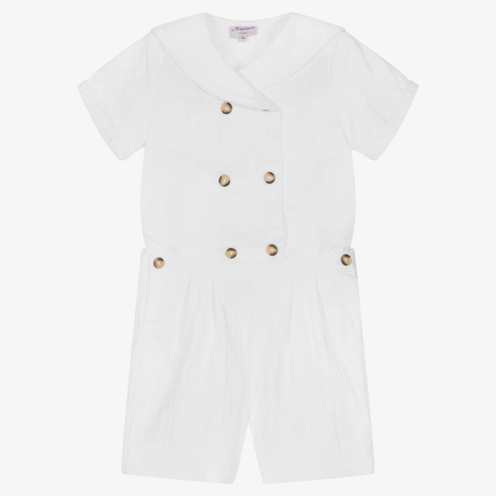 From French brand Kidiwi, a lovely white shorts set for boys. It is beautifully handmade in cotton seersucker with a subtle checked pattern. The shirt has a traditional sailor-style collar and a double-breasted front button fastening. The fully lined shorts have side button fastenings and a partly elasticated waist that is adjustable for a comfortable fit.