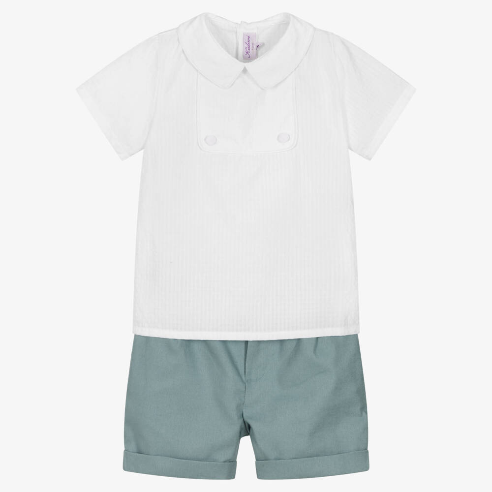 Classically styled and beautifully handmade, this two-piece shorts set for boys is by Kidiwi. Made in a soft cotton blend, the white shirt has a smart pointed collar and a traditional bib front trimmed with buttons. Woven in a viscose and linen blend, the sea green shorts are pleated on the front and fully lined in lightweight cotton for comfort. They have slanted hip pockets, an elasticated adjustable waist for a good fit, and fasten with a concealed button on the front.