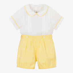 Charming white and olive green buster suit for little boys by Kidiwi, ideal for special occasions. The top is made in a lightweight cotton poplin, with smart pin tuck detailing and an elegant Peter Pan collar. It fastens with buttons on the back and is designed to be attached to the shorts, so that it always stays neatly tucked in. The green velvet shorts have an adjustable waistband for a comfortable fit.