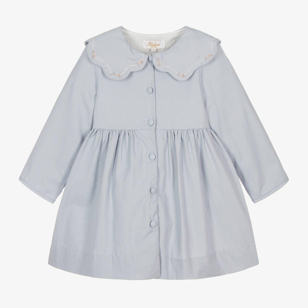 Effortlessly stylish, light blue cotton dress for girls handmade by Kidiwi. This soft twill dress fastens with buttons on the front and is fully lined for easy and comfortable dressing. The skirt is slightly gathered at the waist creating a light flare and two pockets are concealed in the side seams. It is finished with a large scalloped collar with dainty embroidery.