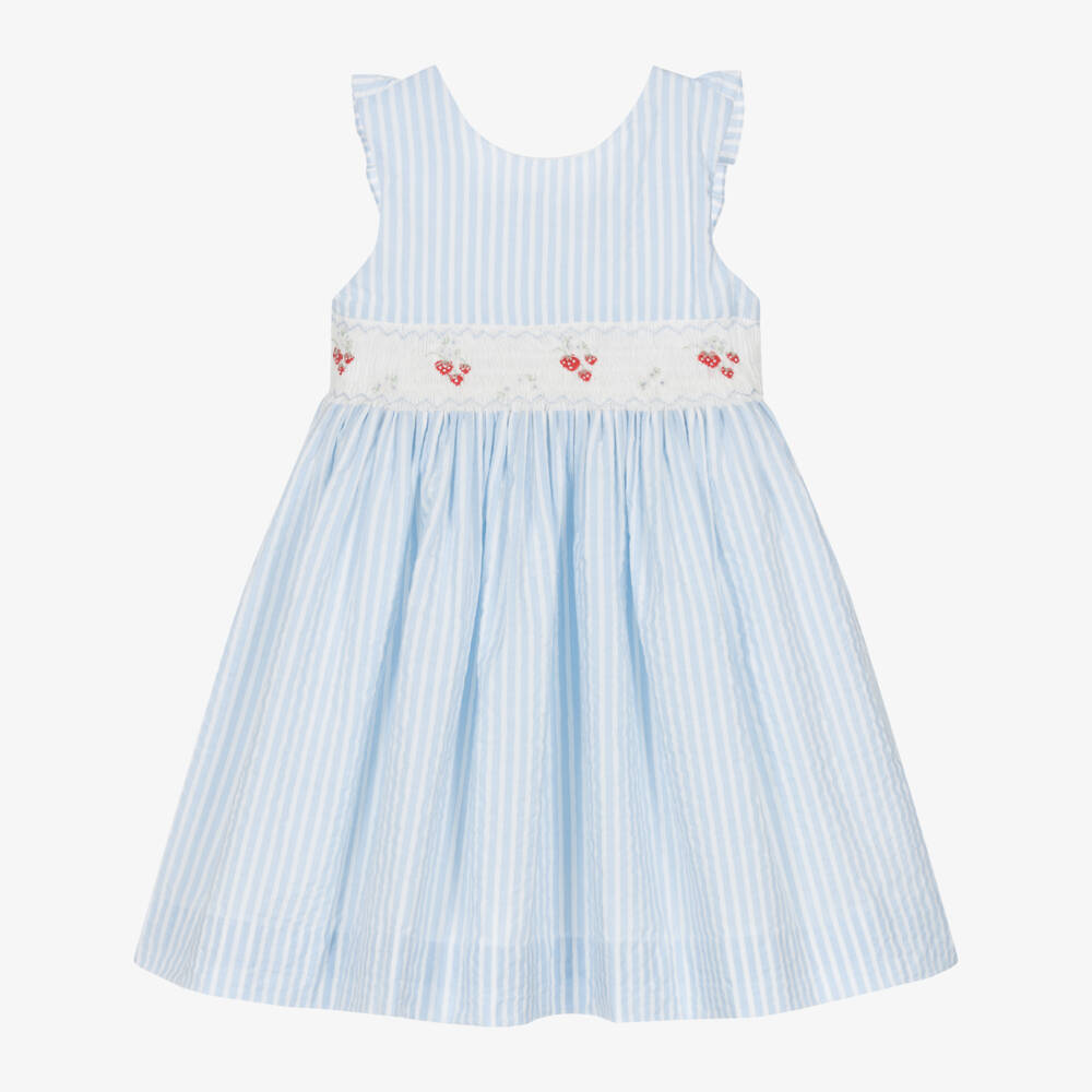 A charming pale blue striped dress for girls by traditional French brand, Kidiwi, handmade in soft seersucker. Lovely for warm summer days, this sleeveless design has a hand-smocked panel on the front, beautifully detailed with delicate floral and strawberry embroidery. Trimmed on the back with a ruffle, it is lined for comfort and fastens with a concealed zip and sash.