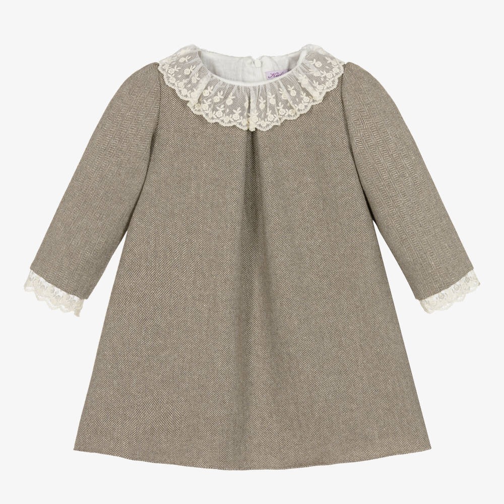 A brown herringbone tweed dress for girls by Kidiwi, beautifully handmade from a cotton and wool blend. Lined in lightweight cotton voile, it has a pretty, embroidered ivory lace collar with matching trims on the cuffs. Classic in style, this dress has a charming A-line silhouette, and a concealed back zip for a discreet finish.