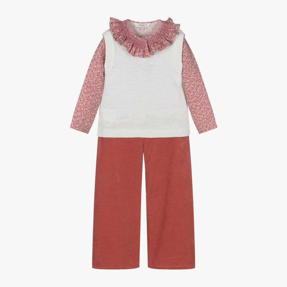 A lovely ivory and terracotta red trouser set for girls, handmade by Kidiwi. Made in soft needlecord, the stylish wide-leg trousers have decorative buttons on the front patch pockets, a useful adjustable waistband and a concealed button and zip fastening. They pair beautifully with the long-sleeved blouse. With a pretty ditsy floral print, it has a hand-smocked ruffle collar adding a traditional touch and pearlescent button fastenings. An ivory slipover, knitted in extra fine Merino wool, completes the look.