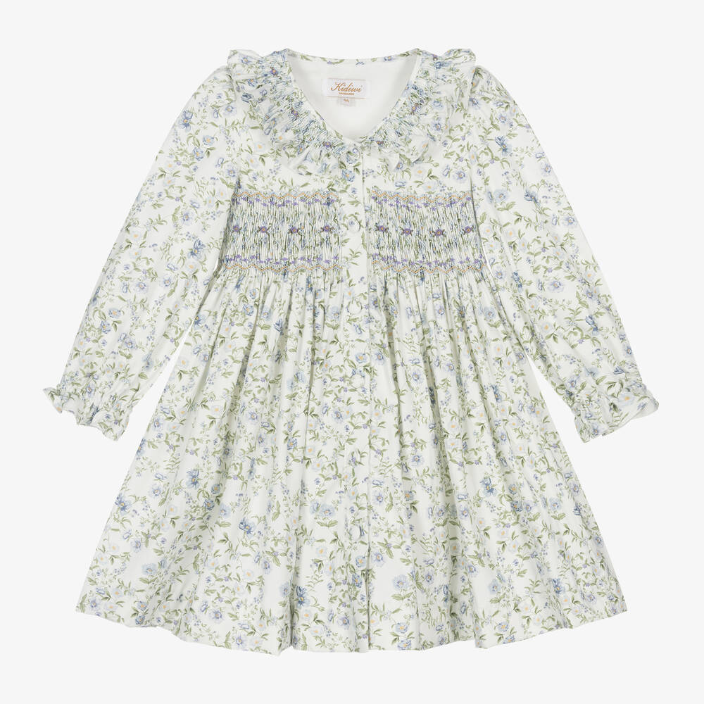 Traditional ivory dress for girls, handmade by Kidiwi in soft cotton twill with a charming floral print. For easy dressing, it fastens with buttons on the front and is fully lined for added comfort. Delicate smocking and embroidery on the bodice and collar give it a classic finish.