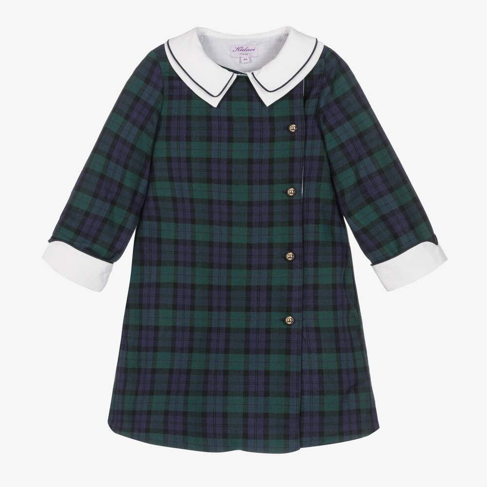 A navy blue and green cotton dress for girls by Kidiwi, handmade in a charming black watch tartan pattern. Classically styled, this long-sleeved dress has a white poplin collar and matching cuffs, edged in a subtle navy blue trim. Fully lined, it fastens with shiny gold buttons on the front and to one side for an elegant finish.