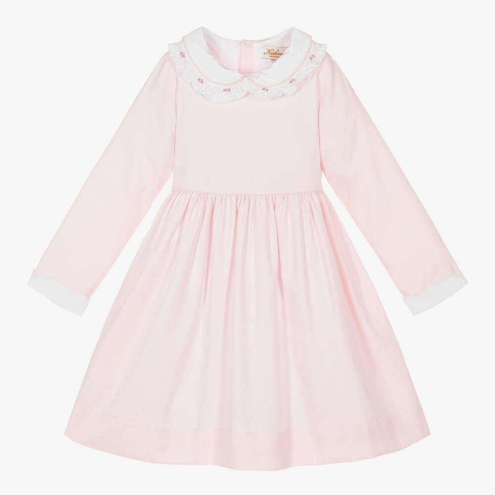 Lovely pale pink cotton dress for girls by traditional French brand Kidiwi, handmade in soft twill. It has a pretty double collar, made in white poplin, one piped in pink, whilst the other has a frilly trim, hand-smocked and embroidered with rose buds. The long sleeves have smart, white poplin, turned-up cuffs and the gathered skirt is full. The dress is fully lined in comfortable cotton and fastens around the back with little buttons and a sash lined in white that ties in a bow.