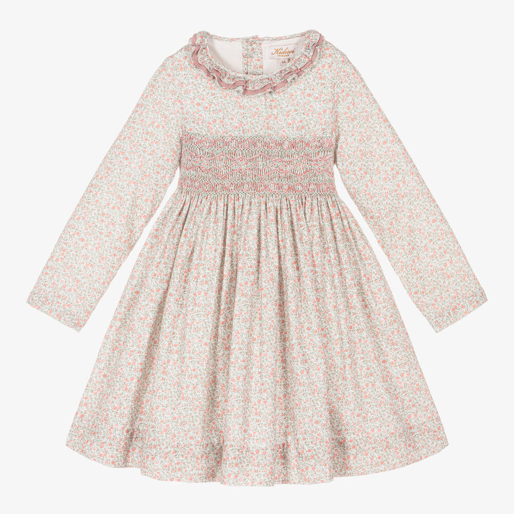 Pretty cotton dress for girls by classic French brand Kidiwi, with a pink and green ditsy floral print on an ivory background. Made in lightweight twill, it has little ruffles around the neckline, one in plain pink, and a traditional, hand-smocked panel across the front, embroidered with little rose buds. Fully lined in cotton voile for comfort, it fastens on the back with buttons and a sash that ties in a bow and is lined in pink.