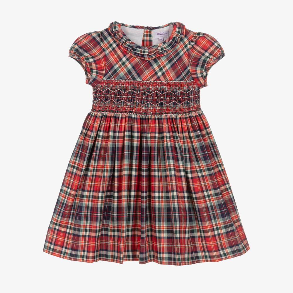 A beautiful traditional red tartan dress for girls by Kidiwi, made from soft cotton twill. It has a gorgeous hand-smocked panel across the chest, a pretty frilled collar, and gently puffed cap sleeves. Fully lined in lightweight cotton for comfort, this dress fastens on the back with elegant covered buttons, alongside pretty ties on the waist to complete the classic look.