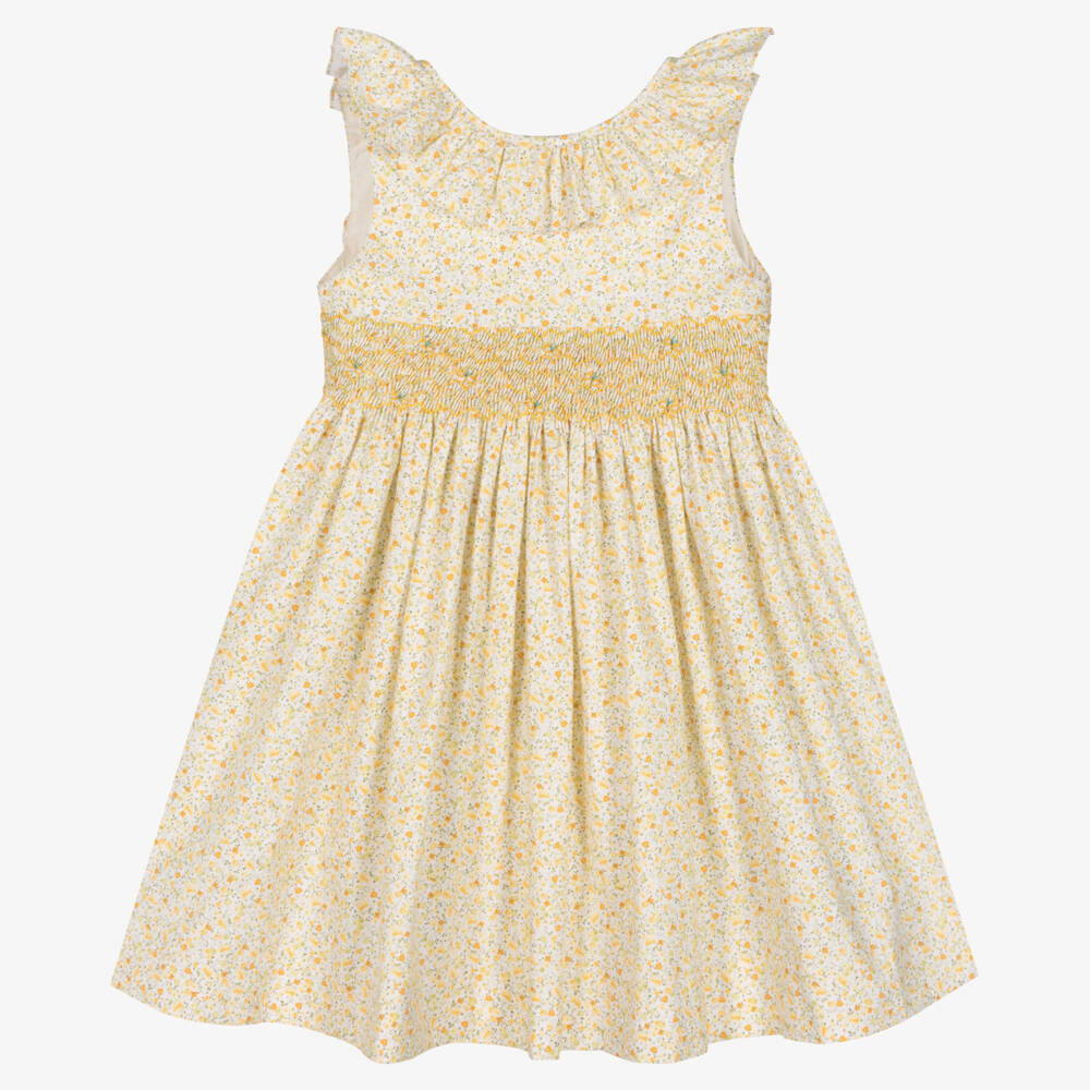 Lovely floral dress for girls by traditional French brand Kidiwi, in delicate shades of yellow. Handmade in lightweight cotton poplin, it has beautiful hand smocking embroidered with yellow flowers across the bodice. The ruffled collar continues down the back, with the ruffles meeting the sash that ties in a bow. The skirt is full and gathered and there is a lining on the bodice for comfort.
