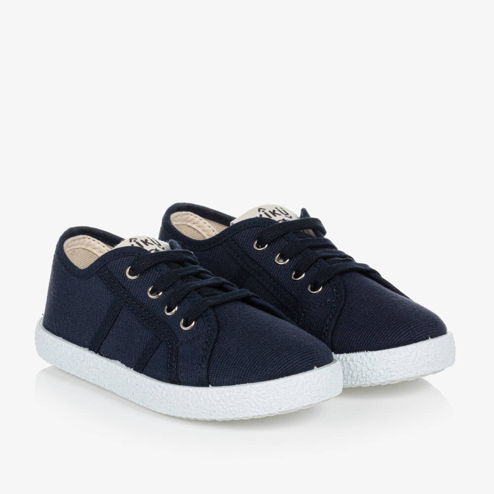 Girls navy blue lace-up trainers from KIKU, handmade in soft canvas. Comfortably lined in soft canvas, they have a padded canvas insole and white, non-slip rubber sole.
