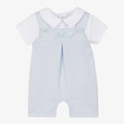 Sweet pale blue dungarees set for baby boys, by Kissy Kissy. Made in luxuriously soft Pima cotton jersey, the bodysuit has an adorable check teddy bear print all-over. It fastens with poppers on one shoulder and between the leg for easy changes. It comes with a pale blue dungarees with a cute embroidered teddy bear on the front. Completing the set, the dungarees fastens with useful poppers on the straps and between the legs for stress-free dressing.