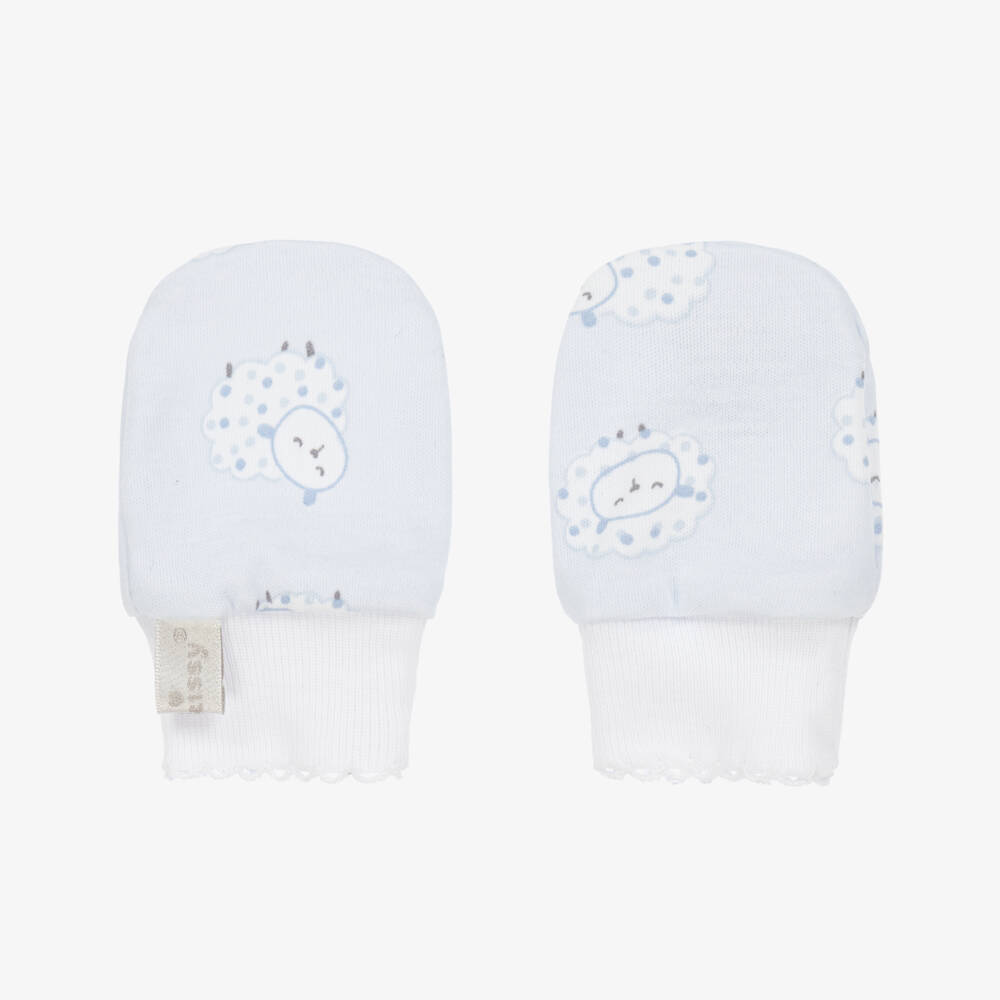 Pale blue scratch mittens for baby boys by Kissy Kissy, made in a beautifully soft Pima cotton jersey. Easy to slip on, they have an adorable white fleecy sheep pattern, with delicate embroidered white trims.