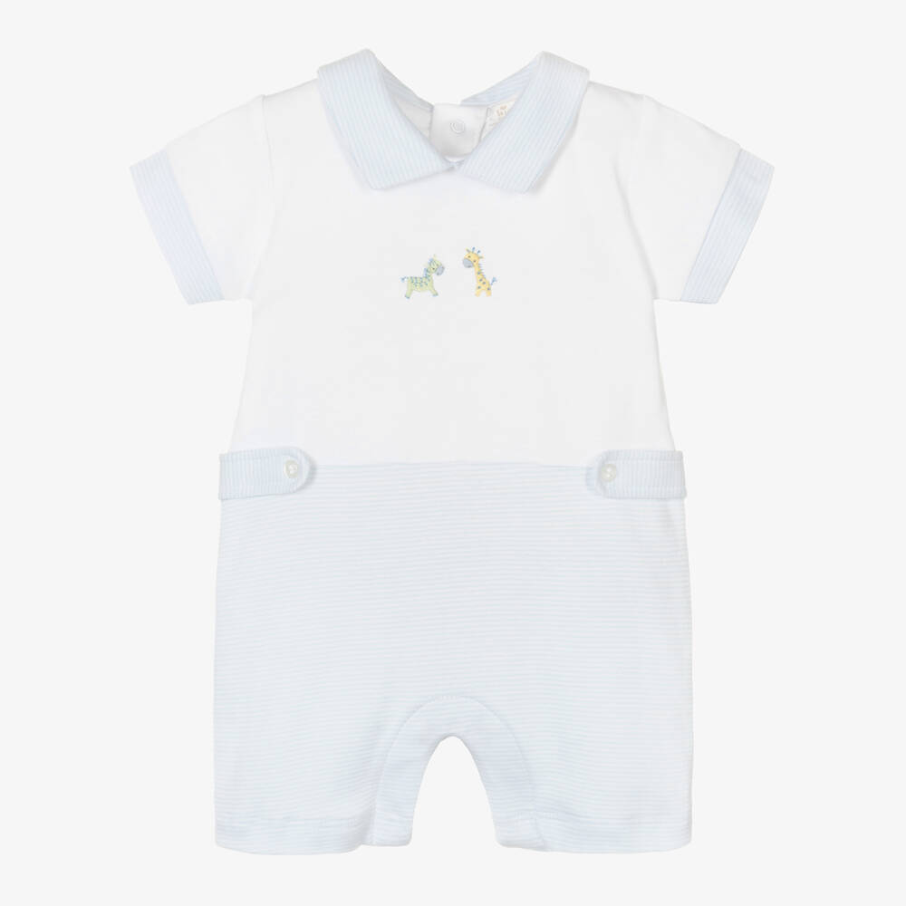Pale blue and white shortie for baby boys by Kissy Kissy, made from soft Pima cotton jersey. Hand-embroidered on the chest is an adorable jungle animal design for a cute look. Printed with a finely striped pattern, it has a sweet pointed collar, cuffs, and tab details on the waist with branded button trims. The popper fastenings on the back and between the legs help with dressing.